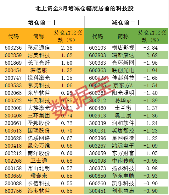 个股方面,93只科技股3月获北上资金逆势加仓,移远通信、洁美科技、长飞光纤、深信服、锐科激光和掌阅科技6股北上资金持股占比环比增加超1个百分点,获北上资金增持力度最大。
