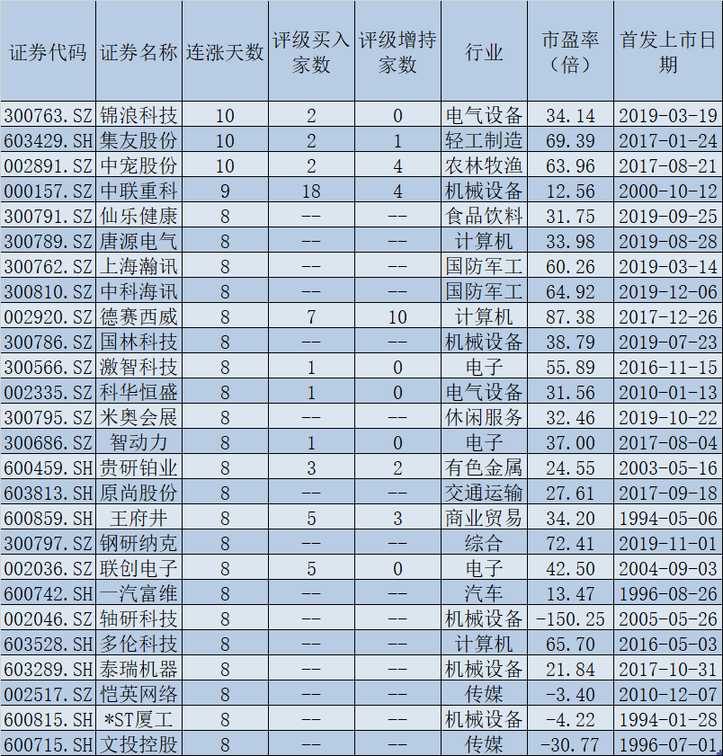 事实上,个股股价的上扬往往与所处行业的景气度存在一定的关联性。65只连涨股中,主要扎堆在医药生物、食品饮料、机械设备等三类申万一级行业,涉及个股数量分别为:10只、9只、8只。
