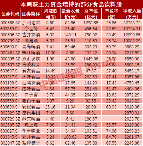 具体到个股来看,安记食品领跑涨幅榜,股价周内上涨25.16%;珠江啤酒居次,同期涨幅17.30%;往后依次是有友食品、日辰股份、爱普股份、嘉必优、妙可蓝多和天味食品6股,股价涨幅均在10%以上。另有包括新乳业、惠发食品、莲花健康和泸州老窖等在内的12股同期涨幅也不俗,均在7%以上。