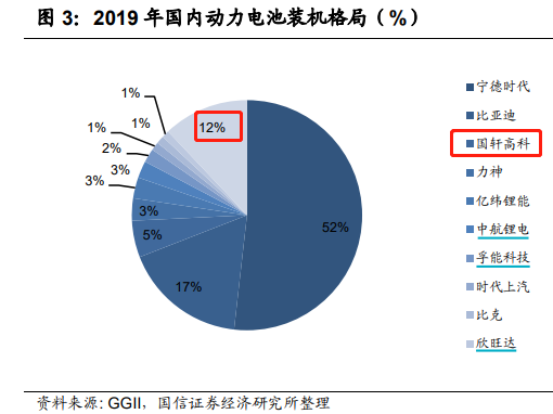 2019 年行业实现动力电池装机量约 62.38GWh,同比增长 9%,国轩高科出货量仅次于宁德时代与比 亚迪位列行业第三,大众入股国轩后有望在资金、订单、技术上全方位对公司形成支持,同时公司稳扎稳打在积极发掘 大众外市场,有望分享行业巨大红利。
