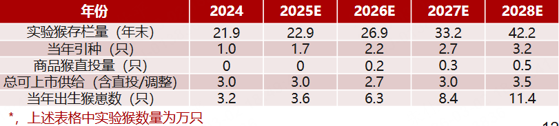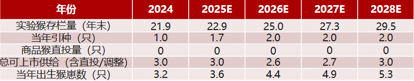 悲观情形下,假设2025年后海外引种效率偏低,年进口量保持在1万只左右,预计2026-2028年国内实验用猴供给量基本维持在3万只左右。