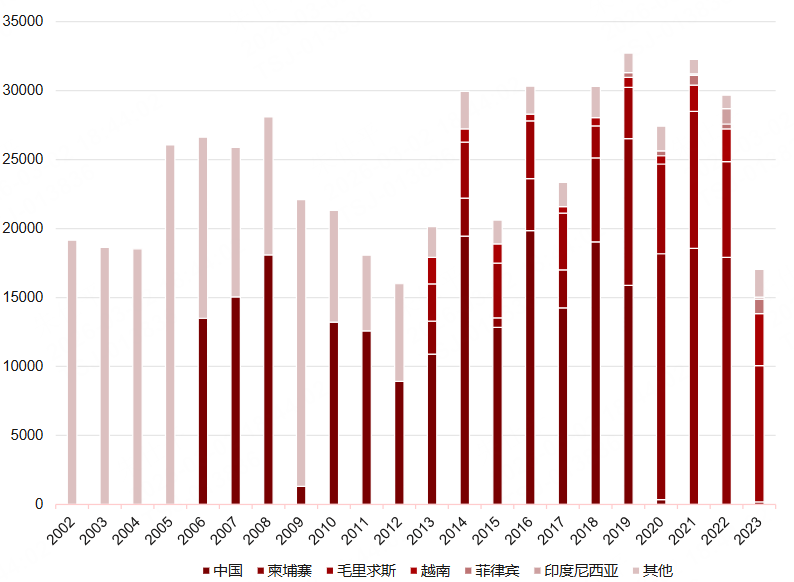 柬埔寨猴资源丰富,是全球重要的供给来源地。截至2023年底,柬埔寨全国6个养殖场的猴子数量达131256只,其中2023年有27322只小猴出生。根据农业部报告,2023年柬埔寨向先进国家(美国、中国、日本、新加坡、韩国和澳大利亚等)出口实验猴12,956只。