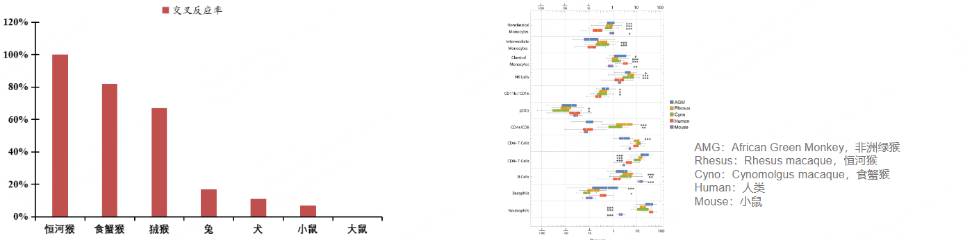 图:单克隆抗体药物与实验动物的交叉反应率 图:每一种物种中不同免疫细胞亚群在全部检测细胞中的比例对比 |
