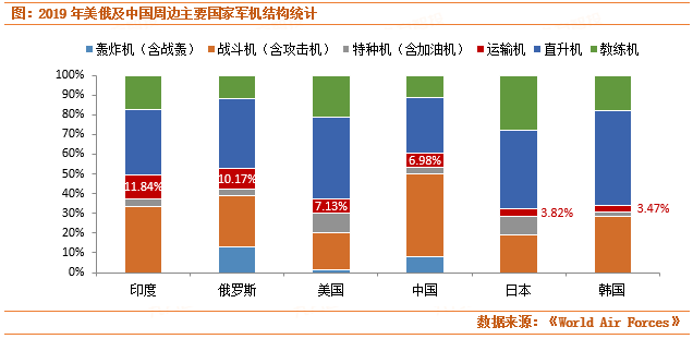 数量上,国内军用运输机市场空间依然很大。对比海外,我国运输机装备水平明显偏低。数据显示,截至2019年,解放军运输机仅占全部现役飞机的6.98%;相较美俄及周边主要国家,我国的运输机装备比例仅高于日韩。