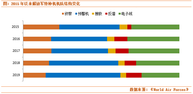 解放军空中特种装备十分注重现代化电子体系作战能力的发展。截至2019年,我军特种机机队中比重前三的机型分别是预警机、电子战飞机以及侦察机;其中,预警机几乎占据了半壁江山,机队占比几乎是第二名电子战飞机的两倍。与此相对的是,国内反潜机与固定翼搜救飞机的发展缓慢。近五年各类机型比重的变化数据显示,反潜机是这段时期内关发展力度堪比预警机的另一亮点,我军海军航空兵部队实践中远海体系化立体作战的短板实现了领的突破。