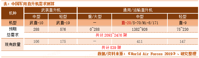 我们估算,相较于国内2019年的主要直升机装备情况,解放军军用直升机总量大概率需要实现翻倍;其中,以直-20为主的中型通用直升机平台总体需求可能超过1300架。中直股份作为国内唯一的自主直升机制造商可能将直接承接未来超过3000亿元的市场需求。