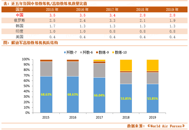 从数量来看,我军教练机装备比例明显偏低,新型高级教练机的装备数量更是少之又少。数据显示,目前解放军教练机装备规模仅占据全部现役飞机的11.40%;这一比例几乎只有美军的一半(21.35%),同时也低于俄罗斯的11.88%。