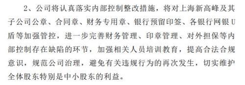 颇为“打脸”的是,亚太药业在10月28日的公告中表示:公司将认真落实内部控制整改措施,将对上海新高峰及其子公司公章、合同章、财务专用章、银行预留印签、各银行网银U盾等加强管控,进一步完善财务管理、印章管理、对外担保等内部控制存在缺陷的环节。