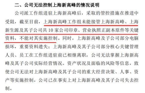 转眼,上海新高峰工作组却因未能接管上海新高峰、上海新生源及其子公司共10家公司印章、营业执照正副本原件等关键资料,不能对其实施控制。