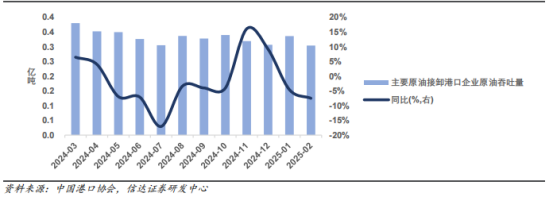 C)原油吞吐量:2025年2月,主要原油接卸港口企业原油吞吐量实现0.3亿吨,同比下滑7.5%