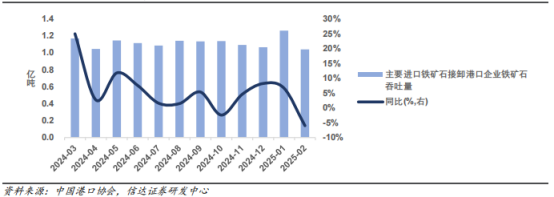 B)铁矿石港存及吞吐量:2025年3月26日,港口铁矿石库存收于1.37亿吨,同比下滑0.16%,环比2025年3月19日增长0.18%。2025年2月,主要进口铁矿石接卸港口企业铁矿石吞吐量实现1.04亿吨,同比下滑6.02%。