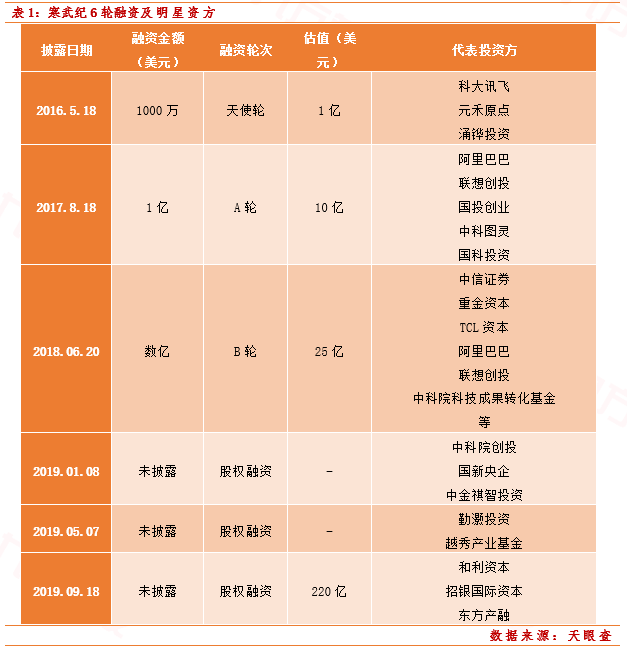 在资本寒冬,顶着“高端智能芯片”光环的寒武纪融资显得格外顺利和亮眼。自创立以来,寒武纪已经完成了6轮融资,融资金额大且频率高,其在资本市场的受青睐程度可见一斑,投资方中不乏联想创投、阿里巴巴创投、中国国有资本风险投资基金、国新启迪、国投创业等明星创投团队。