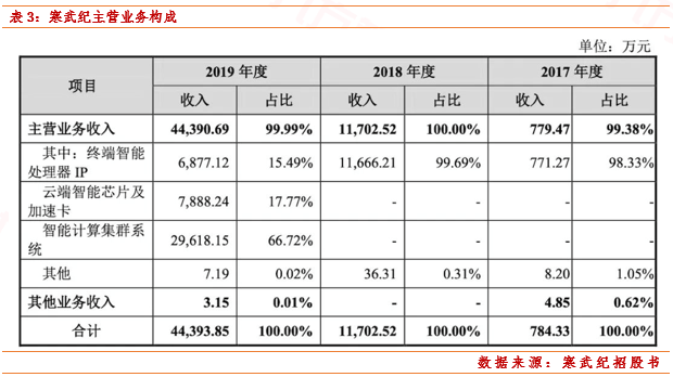 从寒武纪主营业务构成来看,随着资本倾注和研发投入增加、市场渠道拓展,公司业务也从前期单一的终端智能处理器IP业务拓展至云端智能芯片及加速卡、智能计算集群系统领域,新增的业务大大提高了公司的营收,且增强了公司的抗风险能力。