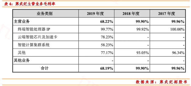 同时,作为技术密集型企业,寒武纪的毛利率远高于科创板公司的均值,尽管2019年的两项新业务导致公司的综合毛利率从99%降至68%,但仍然维持高毛利,显示出公司技术的护城河较深,议价能力较强。
