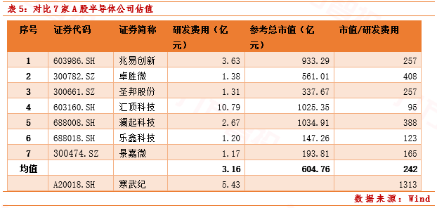 再选取7家芯片上市公司的市值/研发投入的均值242倍,预计寒武纪市值要达到1300亿以上,当然,由于寒武纪当前的盈利能力尚不确定,这更适合作为公司的估值上限。