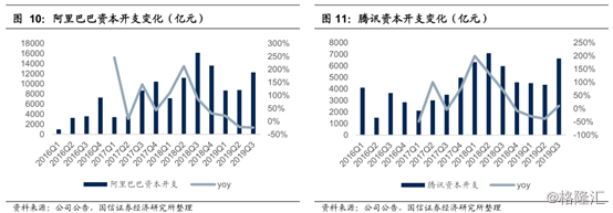 国内方面,以BAT为代表的一线龙头企业对云产业的投入相比国外龙头呈现更高增长弹性。据国信证券研究报告数据,阿里巴巴及腾讯在的资本开支在经过2018年Q3有所回落之后,2019年Q3再度呈现大幅增长。