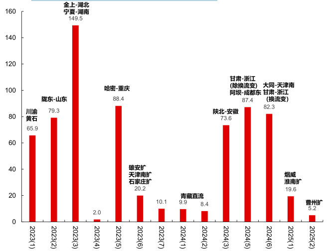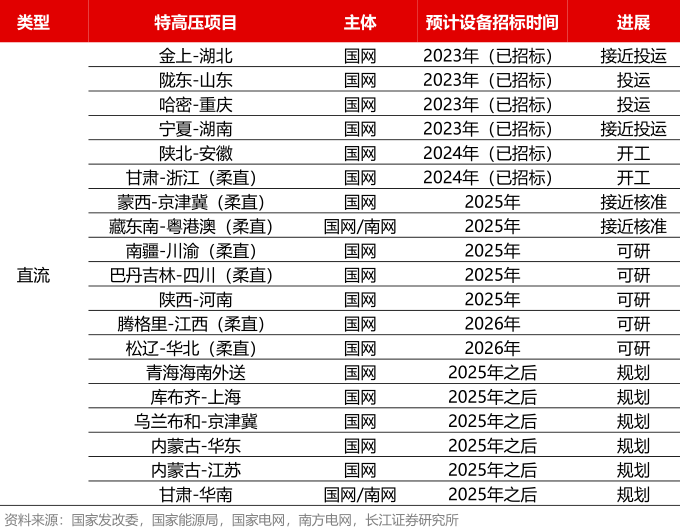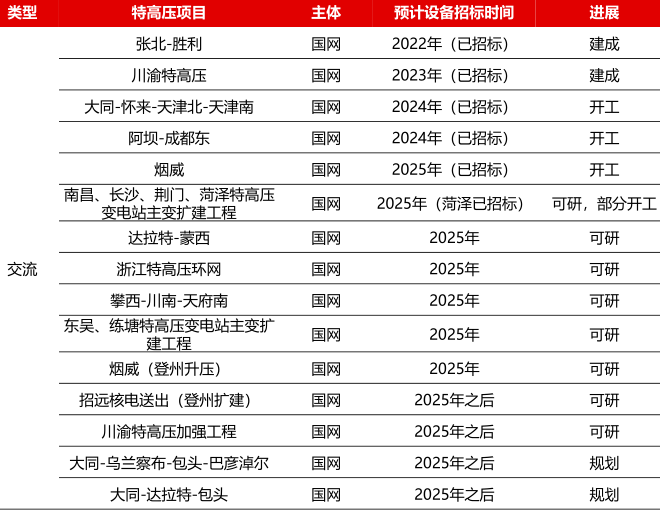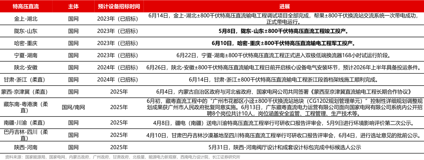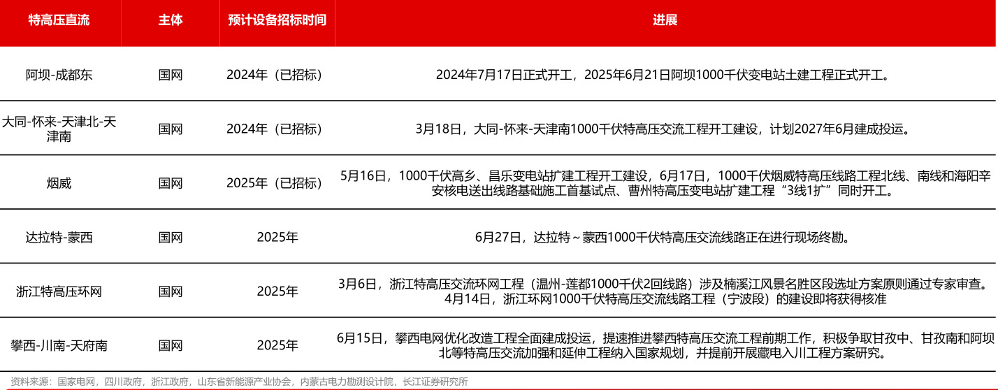 特高压交流方面,2024年末启动川渝特高压加强工程,2025年上半年启动东吴、练塘扩建及烟威登州升压、扩建等项目可研,储备仍旧丰富。