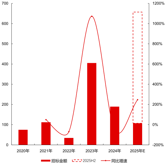 目前2025年特高压已经完成2个批次的招标,设备招标总额达24.8亿元,材料招标总额达178.7亿元。