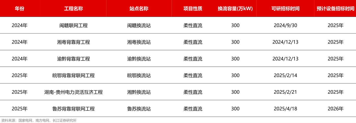 另外,2024年六条跨区背靠背灵活互济工程纳入规划,于2024年下半年至2025年上半年均已完成可研招标。技术路线均为柔性直流,换流容量均为300万kW。根据可研时间,预计除鲁苏背靠背外,其余工程均有望于2025年实现项目核准。
