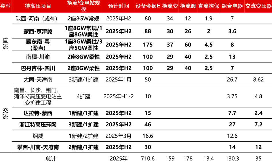 预计随着特高压工程的核准,2025年下半年预计藏东南、南疆-川渝、巴丹吉林-四川、蒙西-京津冀等直流项目以及浙江环网、达拉特-蒙西、攀西特高压等交流工程有望进行招标,总体招标体量可达约550亿元,其中特高压换流阀设备空间有望达到约166亿元。