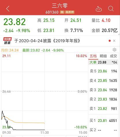 1600亿市值的三六零,红衣教主周鸿祎的股票,今日迎来7亿股解禁,股价“哐当”被砸跌停!上午收盘撬开一丝缝,股价较跌停收高1分钱报23.82元,解禁股市值达167亿元。