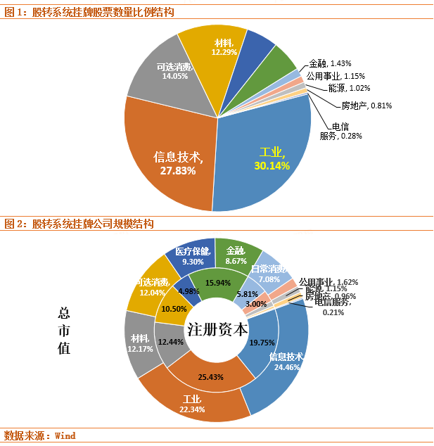 定量来看,工业制造与信息技术行业类企业占全部股转系统挂牌公司总数的绝对多数,科技类行业股票的比例遥遥领先。