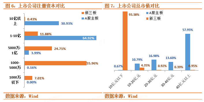 就市值规模而言,新三板之于主板也是天壤之别。数据显示,新三板挂牌公司的总市值基本在10亿元以下,总市值超过10亿元的标的仅占总数的不到7%;相比A股主板近六成公司市值超过40亿元的表现,新三板企业的股价波动性或需慎重看待。