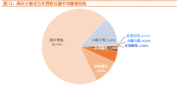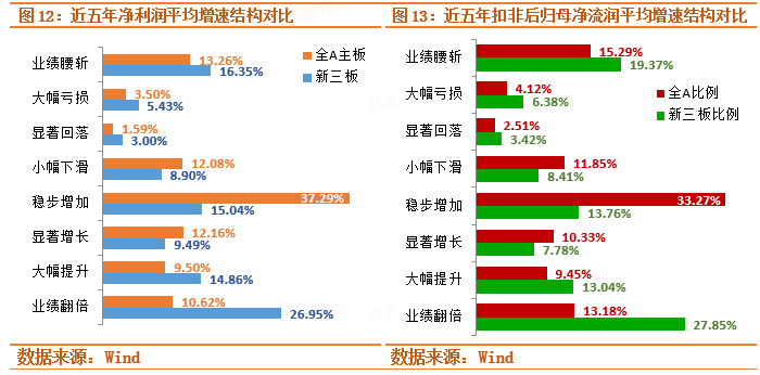 从业绩增速表现来看,新三板金玉其外的特点同样明显。近五年来的数据显示,新三板中总营收平均增速在30%以内的挂牌公司占据了半数以上;近五年平均增速为正的企业比例同样远远高于两市主板。然而,在利润数据方面,近五年净流润平均增速与近五年扣非后归母净利润平均值增速均显示出,新三板挂牌公司的“U型”结构分布同样存在,板块两极分化格局也十分较主板更加突出。