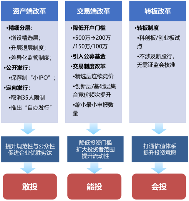 对此,本次精细分层管理改革的核心在于,通过让具有不同风险和流动性特征的企业与相应类别的投资者更好地进行匹配,提升投资和交易效率,实现新三板挂牌企业的权利与义务相匹配。就具体措施而言,改革后,新三板不仅将增设精选层以完善分层设置,还调整明确了各个层次的定位、规范了各层次的权利和义务,并且通过建立升/退级层机制实现优胜略汰、净化市场。