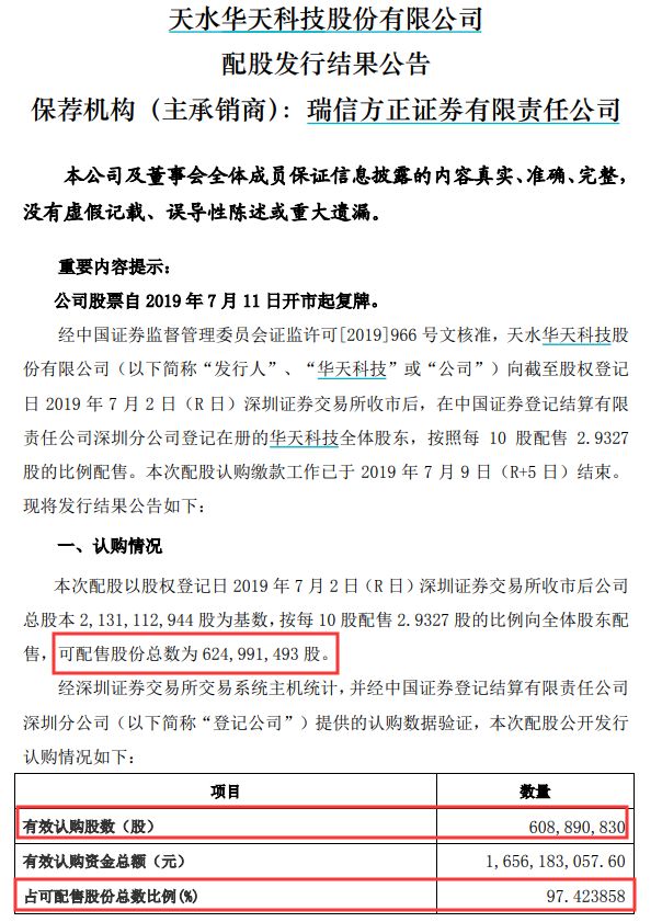 又如今年7月华天科技配股6.25亿股,实际有效认购配股数6.09亿股,占可配售股份总数比例为97.423858%。