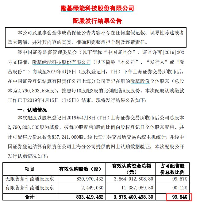 比如今年4月隆基股份配股8.37亿股,最终有效认购配股数8.33亿股,占可配售股份总数比例达99.54%。