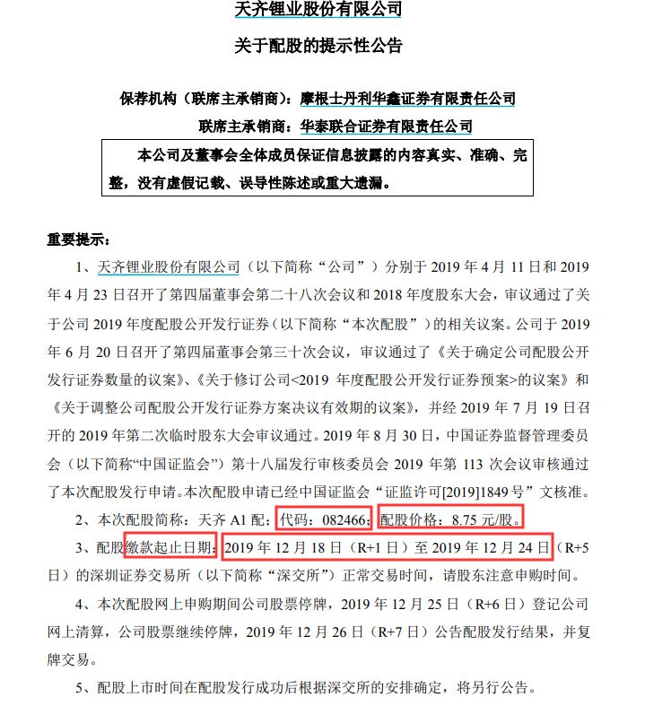 天齐锂业配股 若忘记配股将直亏16%