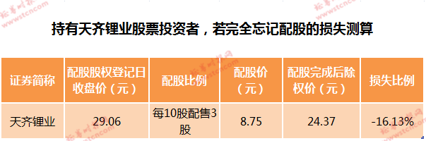 情形二,放弃或忘记参与配股。由于配股后股价会除权,届时复牌股价将变为24.37元,按天齐锂业配股股权登记日收盘价29.06元计算,将直接亏损16.13%。