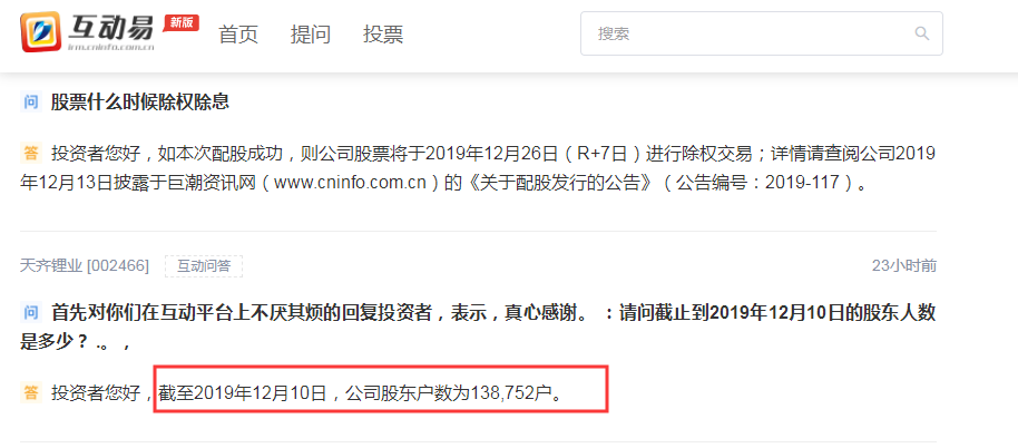 截至12月10日,天齐锂业股东户数仍有接近14万户。