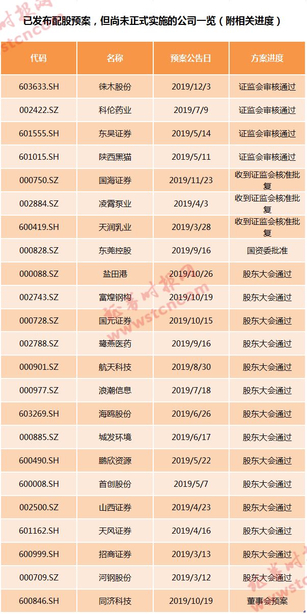 数据显示,当前仍有超过20家公司提出配股预案,但尚未实施,其中盐田港、富煌钢构、国元证券等多公司配股方案已获得股东大会通过,另有徕木股份、科伦药业、东吴证券、陕西黑猫等公司的方案已获得证监会审核通过,国海证券、凌霄泵业、天润乳业则已收到证监会核准批复。