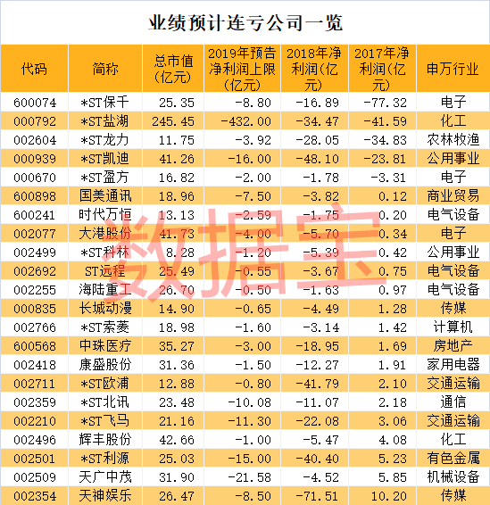 实际上,上述业绩预亏公司中,部分公司已经出现连续亏损情况。数据显示,5家公司2017年、2018年均为亏损,且2019年为预亏状态,分别是*ST保千、*ST盐湖、*ST龙力、*ST凯迪、*ST盈方。