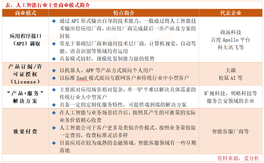 就商业模式而言,人工智能行业则主要包含了四种类型——应用程序接口(API)调取、产品订阅/许可证授权(License)、“产品+服务”解决方案和效果付费。具体来说,API调取模式常见于基础层和通用技术层厂商;产品订阅/License主要以标准SaaS模式面对互联网客户和传统行业中小型客户,并以机器人、APP等方式面向个人用户;“产品+服务”解决方案则主要面向传统行业中大型客户;按效果付费常见于较为金融与智能客服等较为成熟的领域。