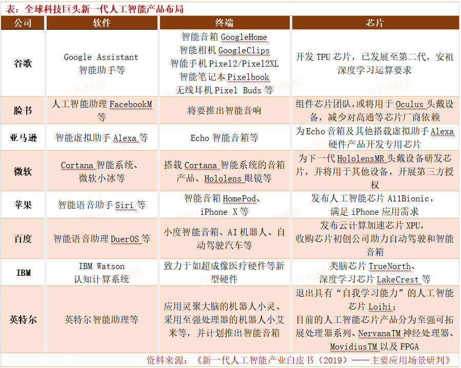 其二,业内科技巨头正普遍开始从技术输出商向解决方案提供商转变。目前,全球各大科技巨头开始基于深度学习等技术对现有和未来产品体系进行整体规划,开展“软件+硬件+应用+芯片”产品布局。一方面,科技巨头纷纷将新一代人工智能技术应用于现有产品体系,改造和提升现有体系与产品性能;另一方面,诸如Google等公司不仅面向个人消费市场开发基于新一代人工智能的软硬件产品,并集成已有产品抢占用户入口,同时也针对行业市场开发新一代人工智能应用,拓展第三方产线。总体来看,在人工智能产业中占技术龙头的优势企业正在进一步寻求基于技术核心优势的竞争力拓展和提升。