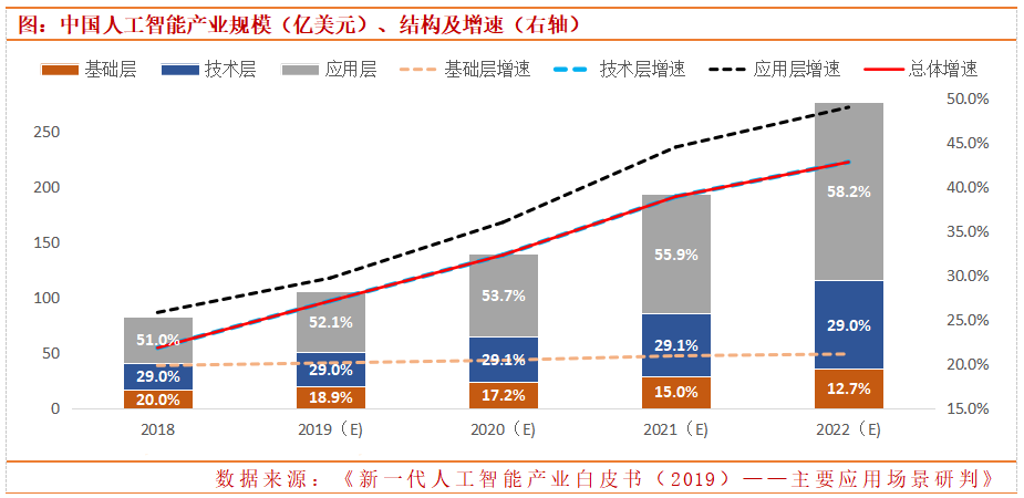 另一方面,我国新一代人工智能产业在制造、交通、金融、医疗、教育等领域的市场空间巨大,大规模高质量的用户基础与亟待升级的产业基础将共同推动应用层发展持续提速;业内认为,随着国内新一代人工智能应用层模式向全产业链渗透和场景革新优化的逐步转变,相关产业规模将在2022年达到161亿美元。
