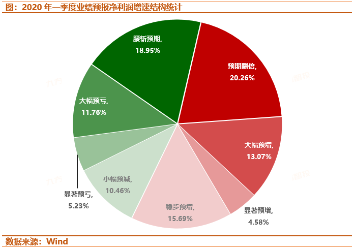 但是,预期一季度业绩增幅50%一下的个股比例却较2019年年报数据录得腰斩。此外,对比一季度业绩预亏与2019年录得业绩回落的个股表现,一季度大幅预亏的公司比例较年报中同类个股的比例双双翻倍。简单来说,今年一季度业绩预报再度呈现出明显的分化态势,这一特征与2018年下半年及2019年同期十分相似。