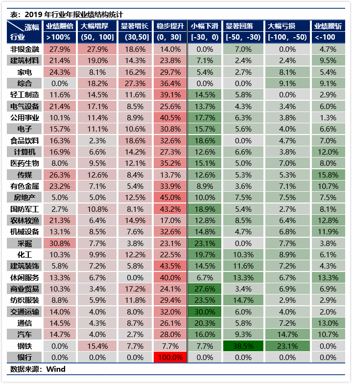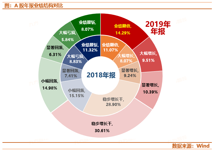 其中,64.8%的上市公司实现业绩同比增长,35.20%的个股录得全年业绩回落。就年报业绩结构来看,2019年录得业绩同增的上市公司不仅在总量上明显优于2018年,而且在业绩增长结构上较2018年全面提升。可以说,A股2019年的业绩表现基本印证了全年国内宏观经济总体出现复苏向好迹象的情况。