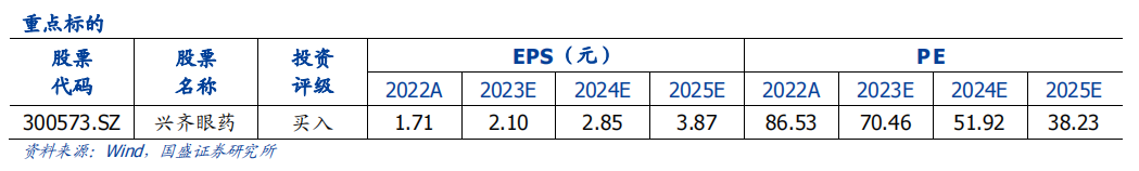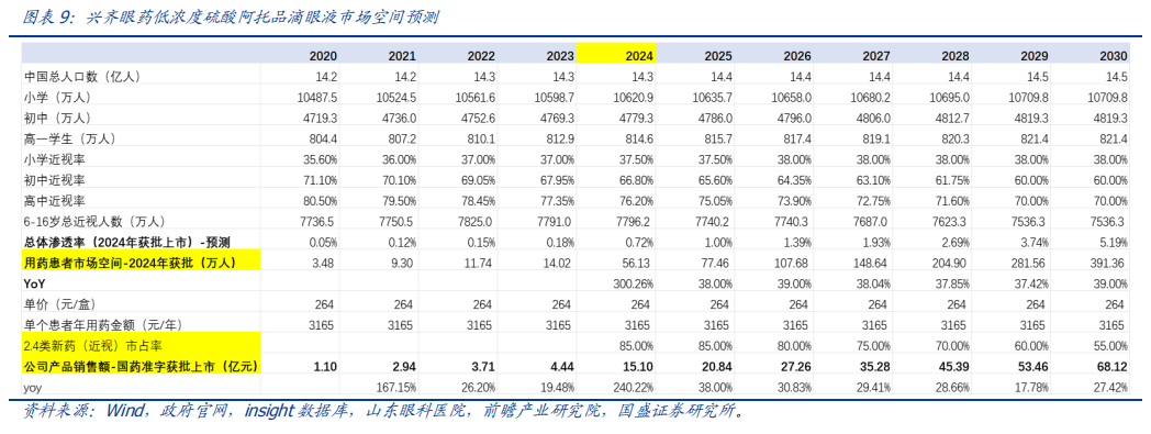 若兴齐眼药低浓度阿托品滴眼液2024年顺利获批上市,参考后来者的审批进度,公司有望获得近2年的产品独占期,为公司业绩带来较大弹性。基于2024年顺利获批的情况,假设该产品上市首年渗透率快速提升,预计兴齐眼药低浓度硫酸阿托品滴眼液2024年收入有望达到约15亿,在渗透率逐步提升的情况下,在2030年收入有望达到约68亿元。综上,在国内近视人群近7亿,青少年近视防控市场已经成为新蓝海的背景下,可以留意兴齐眼药的长线布局机会。