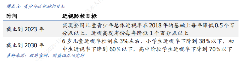 在愈发严重的青少年近视问题下,教育部、国家卫生健康委等八部门在《综合防控儿童青少年近视实施方案》中,制定了2023年和2030年青少年近视防控的具体目标。依照2018年的近视数据来看,2030年之前我国6岁儿童近视率还需降低11.5%,初中生近视率还需降低11.6%,高中生近视率还需降低11%。