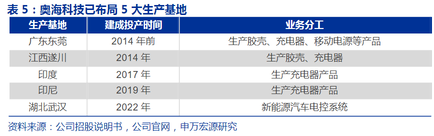公司已布局东莞奥海、武汉智新、江西奥海、印度希海和印尼奥海全球五大智能制造基地,目前越南生产基地也在积极筹备中,设有多基地柔性制造协同能力定制产线,同时具备大规模制造快速响应和多品种小批量柔性出货能力。