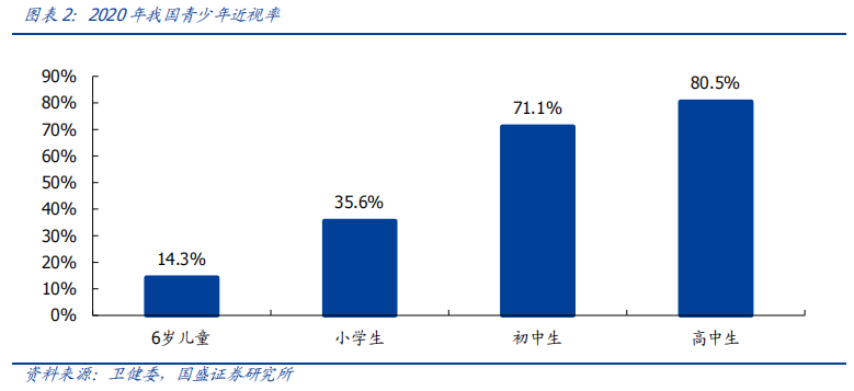 其中,根据世界卫生组织研究报告显示,中国青少年近视率高居世界第一,患病率达50%-60%,并逐年增加。2020年,我国儿童青少年总体近视率为52.7%;其中6岁儿童为14.3%,小学生为35.6%,初中生为71.1%,高中生为80.5%。