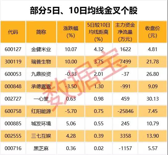 截至5月8日收盘,有9只A股的5日均线主动上穿10日均线,其中金健米业、瑞普生物、九鼎投资等个股的5日均线较10日均线距离最大,分别达4.32%、3.75%、2.01%。