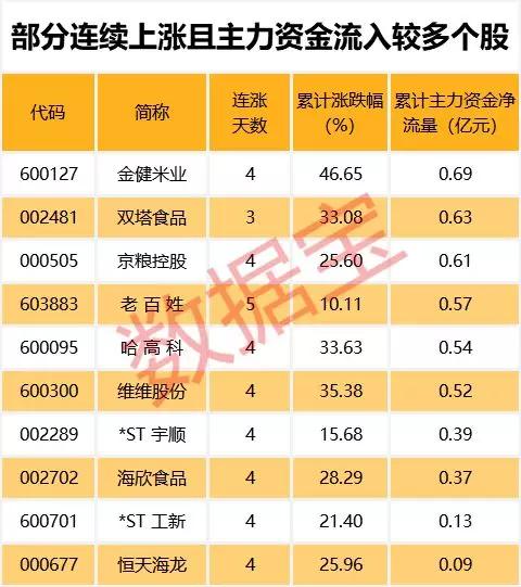 值得注意的是,22只连续上涨个股中,6只个股期间主力资金累计净流入超过5000万元。其中,累计资金流入最多的为金健米业,主力资金累计流入0.69亿元。