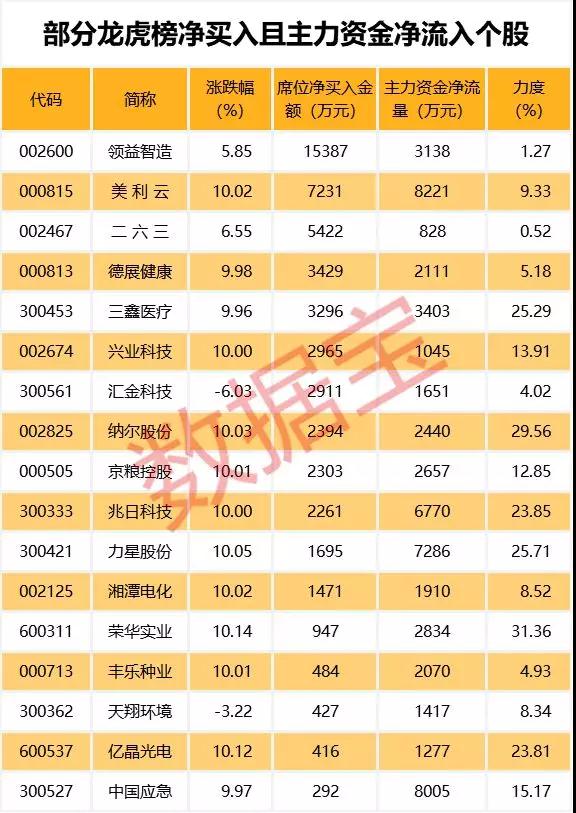 从盘口资金流向来看,主力资金净流入超千万且龙虎榜净买入个股共有16只,其中美利云、中国应急、力星股份等个股资金净流入金额最大。净流入力度最大的个股有荣华实业、纳尔股份、力星股份,净流入力度分别为31.36%、29.56%、25.71%。