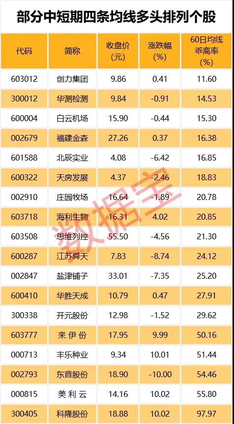 截至5月8日,18只个股5日、10日、20日、60日四条均线近日呈多头排列。其中创力集团、华测检测、白云机场股价与60日均线的乖离率最小,分别为11.6%、14.53%、15.3%。