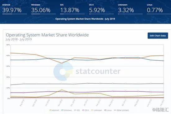 目前,Android是全球领先的操作系统,市场份额为39%;其次是Windows,市场份额为35%;苹果的iOS,市场份额为13.87%;macOS,市场份额为5.92%;Linux目前是第五大操作系统,占有0.77%的市场份额。